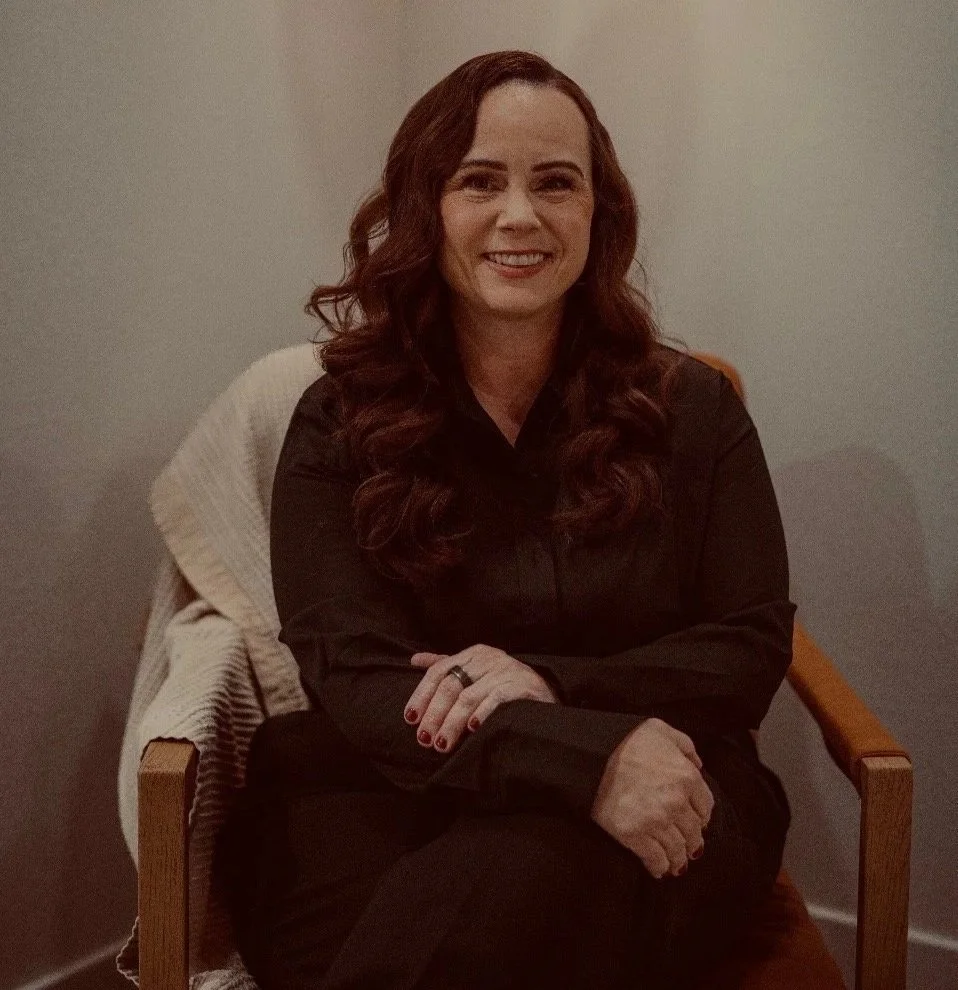 A woman with long brown hair, wearing a black lace top, smiling, with a tattoo on her left shoulder, against a dark background.