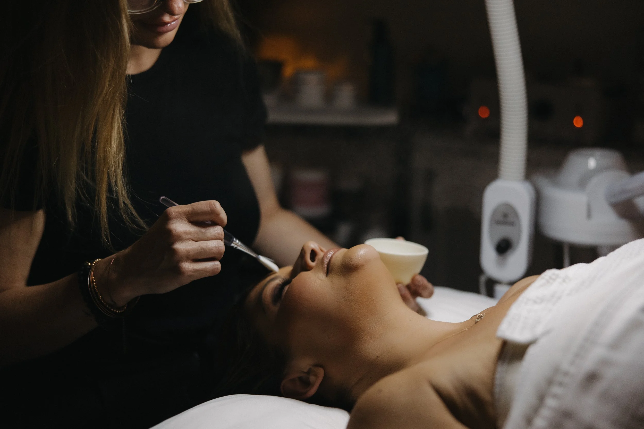 Woman with long reddish hair wearing black gloves and a black outfit standing in a laboratory or skincare clinic, with shelves of boxes and containers behind her and laboratory equipment on the counter.